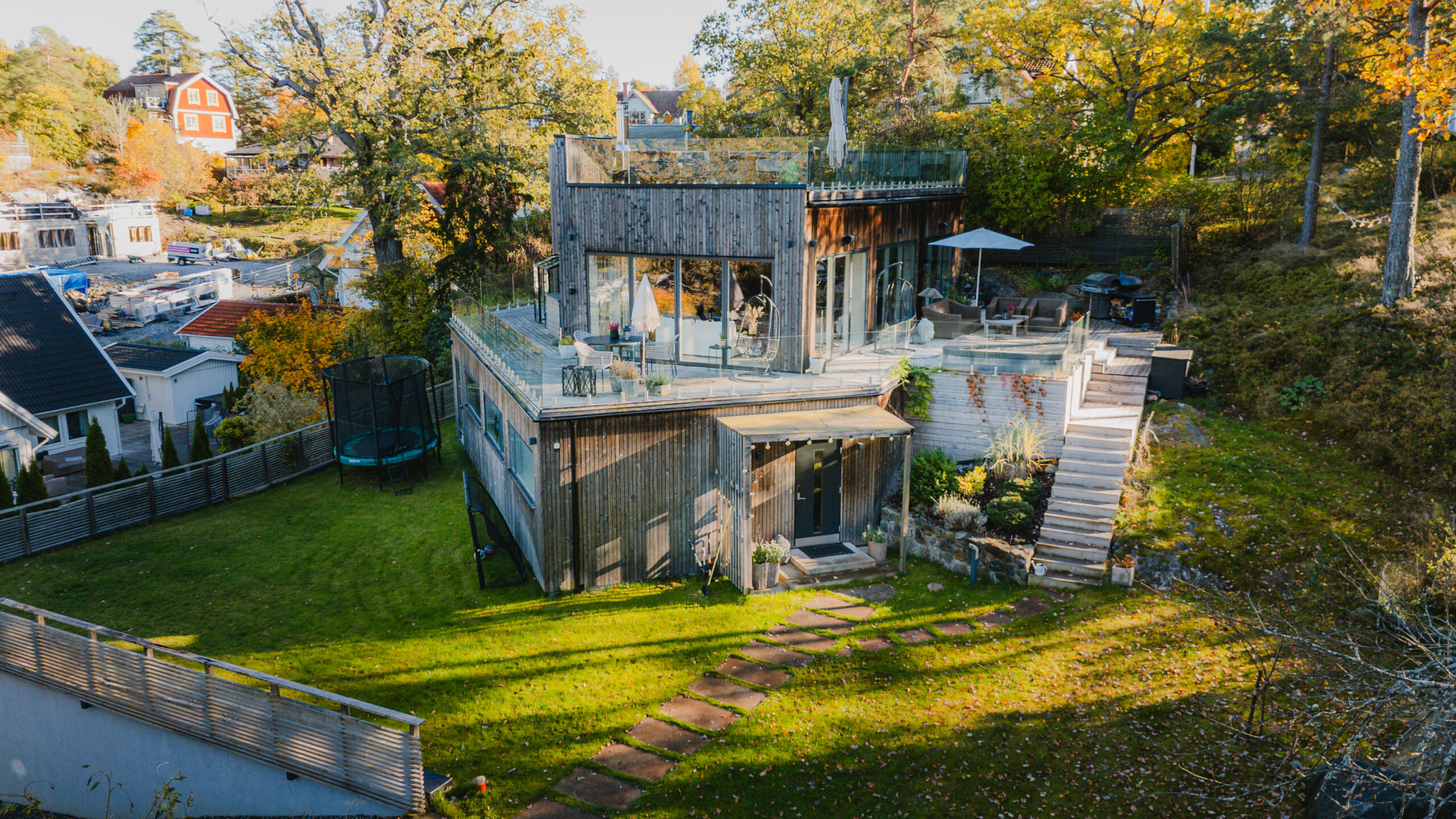 Nybyggd villa med öppen planlösning och taktersass, uteplatser och anlagdträdgård, Villa Pettersson Lidingö – Panton Construction